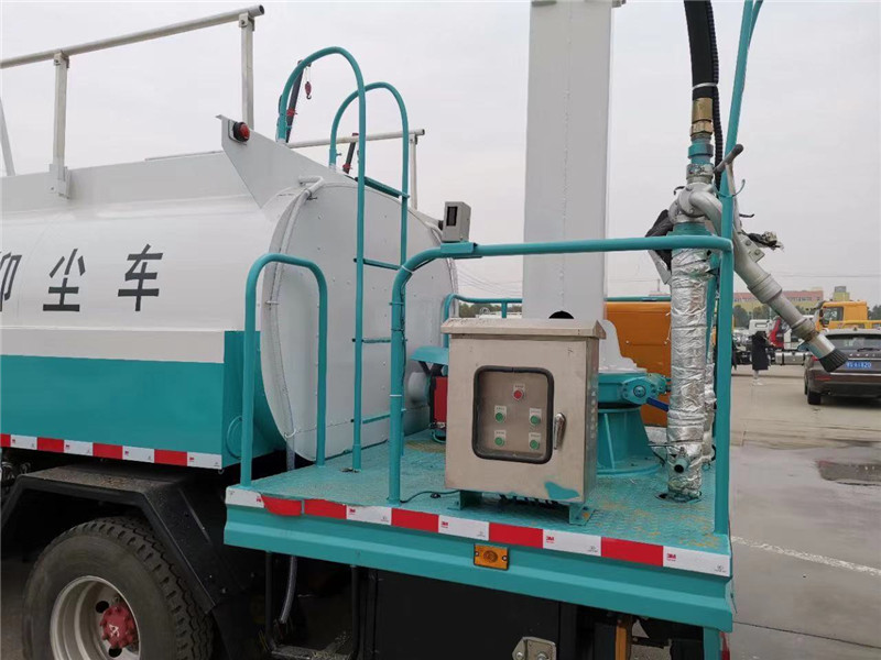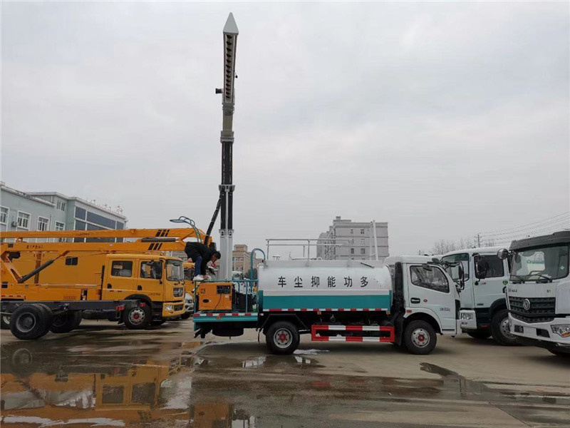 該車主要用途為抑塵降霾,主要裝置為旋臂式噴霧裝置。但是它也帶有灑水車的功能,安裝的有灑水泵,可以自吸自排,車前安裝前沖,用來沖洗路面,鋁合金球閥安裝在車身的左側,左右兩側都安裝有消防接口,以便特殊情況接消防水槍用;后工作平臺兩邊安裝的有后灑,可噴灑5米左右,主要用于空氣抑塵;平臺左邊安裝的有灑水炮,柱狀可噴灑35米,霧狀可噴灑5米左右,主要用于澆灌及抑塵功能。
