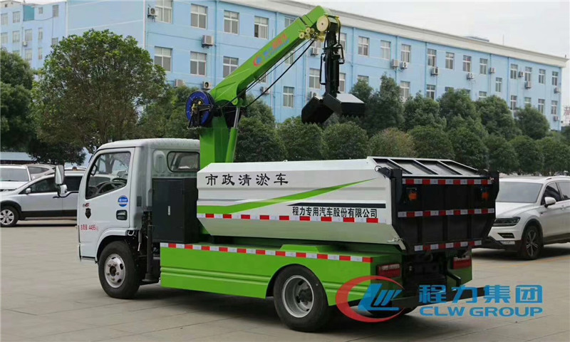 這款市政淤泥清淤車的主要配置是汽車底盤、淤泥箱、轉盤、抓吊裝置、液壓系統和遙控系統等零件組裝而成。在汽車底盤上安裝了自卸式淤泥箱,而駕駛室的汽車底盤上也安裝轉盤,抓吊裝置安裝在轉盤上。抓吊裝置不僅只有立柱、橫梁和抓斗還選用了帶液壓伸縮式吊臂。這款車的結構實用緊湊,可以連續工作,同時也加快了工作效率。