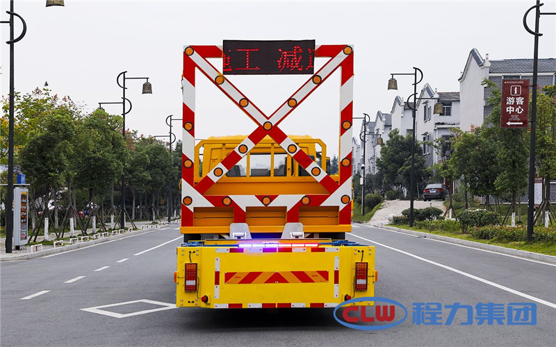 防撞緩沖車尾部設置防撞緩沖塊,防撞緩沖塊采用液壓升降裝置,還配備車載一體化的電子屏、電子箭頭標志牌、頻閃燈及爆閃燈多種警示燈,能夠為后方車輛提供警示和指示方向。箭頭指示標志可對左、右及禁止通行進行導向指示,對道路車輛提供主動安全引導和安全警示,限度降低施工對交通流量的影響并確保安全。尾部升降和燈具采用控制,可在車輛附近安全控制防撞緩沖塊的升降和警示燈的開關。
