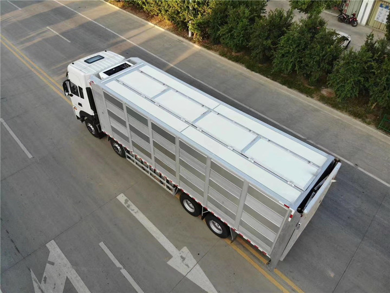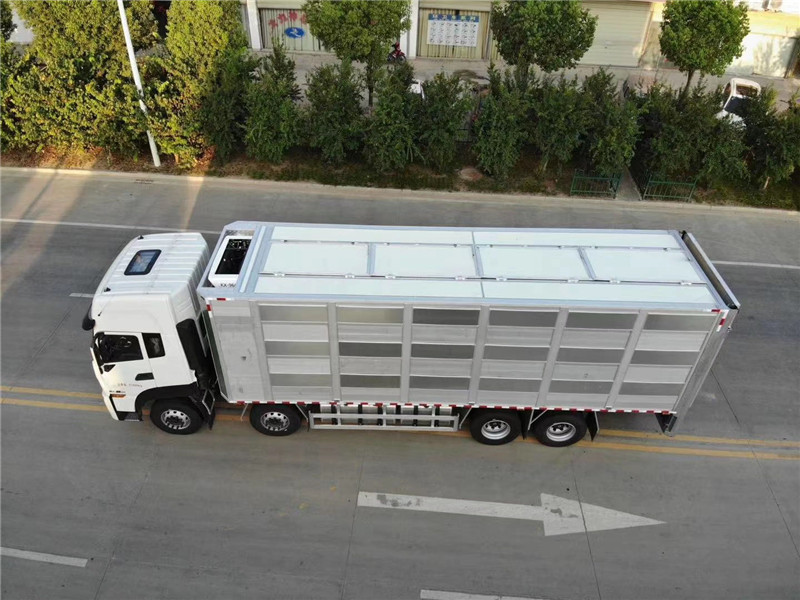 上裝為鋁合金廂式結(jié)構(gòu),廂長(zhǎng)6.8米,寬2.5米,高2.6米,開模型材插接式焊接,車身質(zhì)量輕強(qiáng)度高防 腐蝕性強(qiáng)可耐80度高溫消毒,廂體有效避免高溫傳導(dǎo),內(nèi)部通道和頂板可翻轉(zhuǎn),便于裝卸清洗,車廂恒溫、燃油加熱、監(jiān)控,標(biāo)配三層混合隔倉(cāng)共18個(gè)降溫噴霧和18個(gè)喂食飲水咀,可開合側(cè)窗、每層4個(gè)高轉(zhuǎn)速防水通風(fēng)排氣扇、每層備用電瓶2個(gè)可供排氣扇使用7小時(shí),風(fēng)扇排風(fēng)量 m3/h 500、1200、1400、2200,后部液壓圍板裝卸1.5噸承載力、同步穩(wěn)定上升速度快、圍板面積5平方,三層每層高850mm四層每層高620mm,裝運(yùn)面積每層14.25平方,三層可拉80頭125公斤豬,4層可拉850頭8公斤小豬苗。