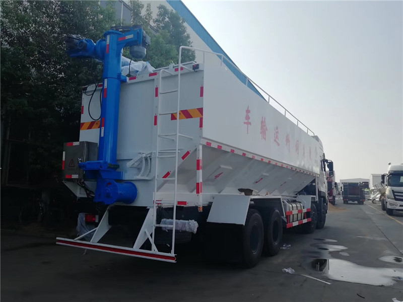 這款飼料車整車3條蛟龍(底部水平絞龍、尾部垂直絞龍、頂部卸料絞龍),由3個5.5kw 380v電機帶動各絞龍工作,頂部絞龍液壓控制舉升,可左右旋轉180°,整車尺寸:9000×2450×3800mm,罐體尺寸:6100×2420×1930mm。散裝飼料運輸車具結構簡單、性能可靠、輸送量大、操控方便、機動性強、對物料無污染的優點。是各大養殖廠急需的高科技產品,散裝飼料運輸車在同行業中更是佼佼者,一臺高品質的飼料車需要擁有強勁動力的底盤。