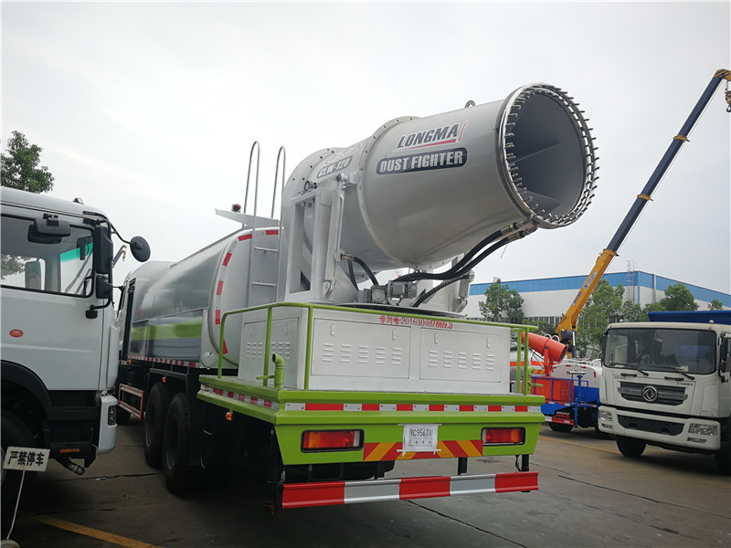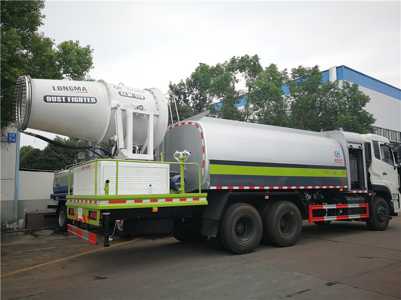 這款東風天錦抑塵車主要結構是在行走機構上加裝方型大容積水罐、高效遠程霧炮系統、大功率專用自吸自排水泵,中低壓沖洗灑水系統、綠化灑水高炮(可選裝自動灑水高炮,在罐體前端)等等而改裝組成 罐體容積大(方罐容積12立方),免征產品。副發動機為柴油120KW發電機組,11KW水泵,37KW風機發動機,鋁合金扇葉。無線操作(100米),及手動操作。霧化距離80米(靜風室內距離)實際射程:(霧化射程會受濕度、溫度、風速等各方面天氣因素的影響,另外天氣干燥地區一部分在空中被蒸發掉)。