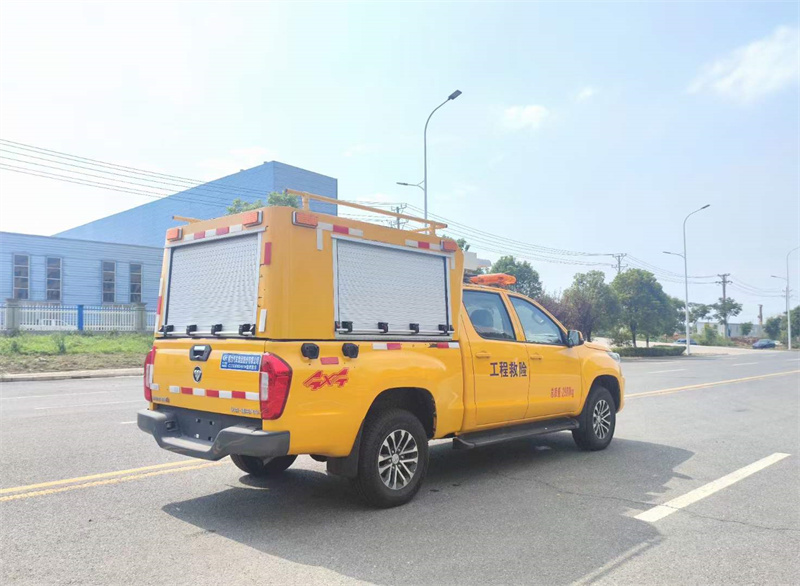 該車頂部安裝了工程警燈,車身采用醒目的工程黃,并貼有”工程救險車”的大字。多方位圖:底盤配置:鹵素大燈、245/70R16輪胎、鋁合金輪輞、仿皮座椅、ABS+EBD、前盤后鼓、前排普通三點式安全帶、后排中間兩點式兩邊三點式安全帶、LED日間福田四驅皮卡工程應急搶險救險車   皮卡式應急搶險救援車具有高承載性,功能實用性和耐用性,具備快速的應急響應能力。