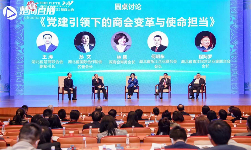 第五屆楚商大會分論壇上,程阿羅會長和東升會長匯報溝通了主題討論內容,作為圓桌論壇嘉賓做了《黨建引領下的商會變革與使命擔當》發言.