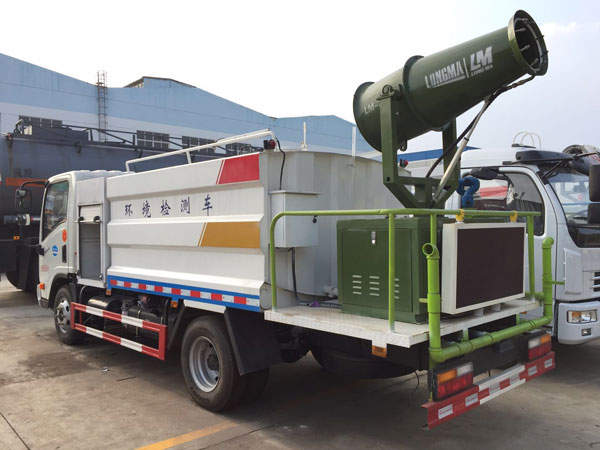 抑塵車主要利用了液壓系統與電控系統的交互作用,即移動式噴灑設備在配液站將噴灑液注入儲液罐,自行到噴灑點;當列車通過時,光電檢測系統開始識別牽引機車,牽引機車通過后,發出信號,由控制人員控制傳動液壓系統旋轉布液管與車廂正交,同時啟動液體泵開始噴灑。并調整液體泵流量達到設計噴灑標準。光電檢測系統在列車鉤檔間發出信號給PLC,控制步進電機或伺服電機通過傳動連接裝置旋轉遮擋滾筒實現停噴和噴灑作業。列車完全通過時,裝置停止噴灑。多功能抑塵車是程力集團專用汽車公司與蘭州交通大學共同研發的多功能抑塵降霾車,該車集綠化灑水和噴霧抑塵于一體,采用環保除塵風送式噴霧機,可用于治理霧霾PM2.5等空氣中懸浮的顆粒。