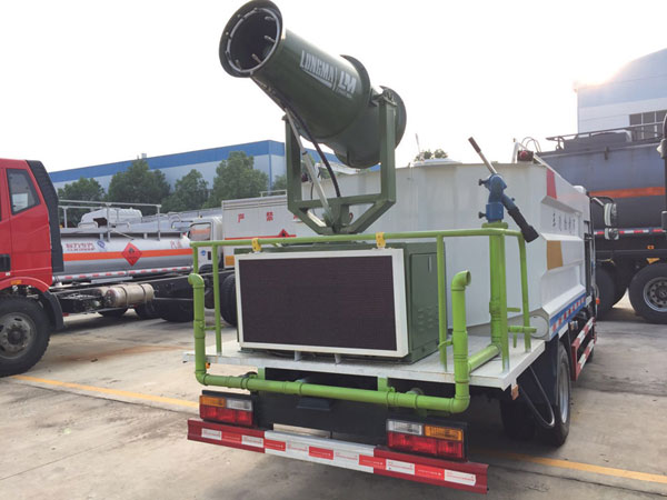 功能配置:帶前部沖洗路面噴灑裝置、后部扇形降塵噴灑裝置,兩側面噴灑裝置,帶后部工作平臺、平臺上安裝綠化灑水炮(炮噴射形狀可調),可調直沖狀、大雨、中雨、毛毛雨,可連續調節,最大射程可達28米,垂直吸程6.5米,揚程14米,另加裝高效率車載式風送噴霧機,噴藥炮霧化效果好,可遠程噴霧,水平射程達25米。帶消防接口、自流閥,可自吸自排。