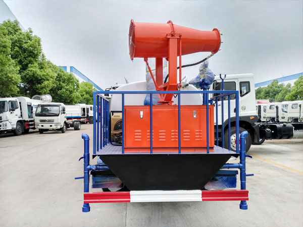★功能配置:帶前部沖洗路面噴灑裝置、后部扇形降塵噴灑裝置,兩側面噴灑裝置,帶后部工作平臺、平臺上安裝綠化灑水炮(炮噴射形狀可調),可調直沖狀、大雨、中雨、毛毛雨,可連續調節,最大射程可達28米,垂直吸程6.5米,揚程14米,另加裝高效率車載式風送噴霧機,噴藥炮霧化效果好,可遠程噴霧,水平射程達25米。帶消防接口、自流閥,可自吸自排。