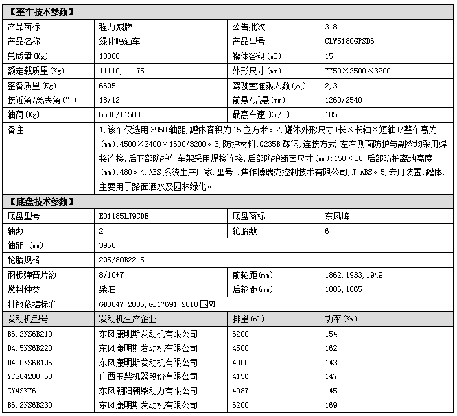 專用配置:罐體容積 15立方,罐體采用國標Q235碳鋼材質,罐體厚度4MM,前后封頭5MM加厚型,罐體內雙層隔板具有防波蕩作用,以減輕汽車行駛時罐內液體沖擊;灑水車整車及外形尺寸嚴格按照國家機動車公告制作而成;裝配大功率專用灑水泵,前沖、后灑、側噴、后平臺帶綠化灑水炮,灑水炮可全方位旋轉,可連續調成直沖狀、大雨、小雨、毛毛雨;配消防接口,自流閥,濾網,帶自吸自排功能。前封頭帶水位計,后平臺主管路帶1寸澆花接口,后爬梯,帶1個消防接頭,帶1個自流閥,1個過濾裝置,其余標配。1、可選裝后平臺帶霧炮機組用于噴霧降塵、農藥噴灑作業;2、可選裝前置電子灑水炮駕駛室操作;3、可選裝氣動球閥駕駛室操作。