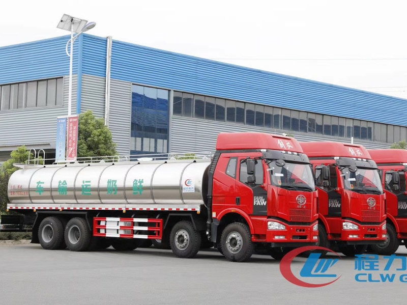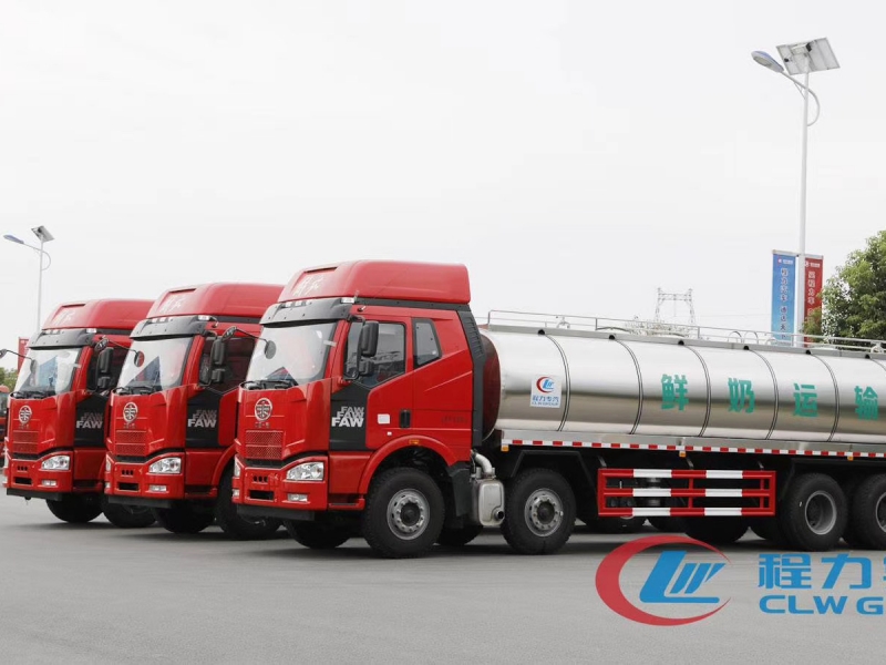 東風解放前四后八奶罐車,一汽解放錫柴325-355馬力可選(國Ⅴ排放),高頂雙臥駕駛室,九檔變速箱,罐體內膽用食品級不銹鋼板制作,容積20-25m3,分四倉,每倉內部均有CIP清洗裝置,罐體內膽作拋光打磨處理,光潔、無銳角,每個奶艙內加清洗裝置, 內層做8公分聚氨酯發泡保溫,罐體外層加2mm厚304L不銹鋼板,30度溫差時溫度變化24時候1-2℃。不銹鋼的外蒙皮造型美觀,結構科學,自重輕,強度好。行駛記錄儀。