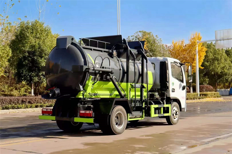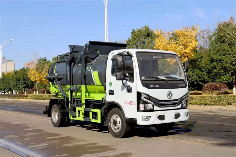 上裝配置:容積5方, 圓形罐體, 厚度4mm, 長源油泵, 中梅多路閥, 海普瑞斯液壓油缸, 液壓舉升卸料,液壓后蓋, 后蓋帶密封條, 尾門液壓鎖緊, 拉桿式提升機, 可掛120/240L塑料垃圾桶, 選裝推板, 干濕分離。