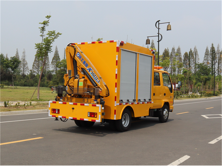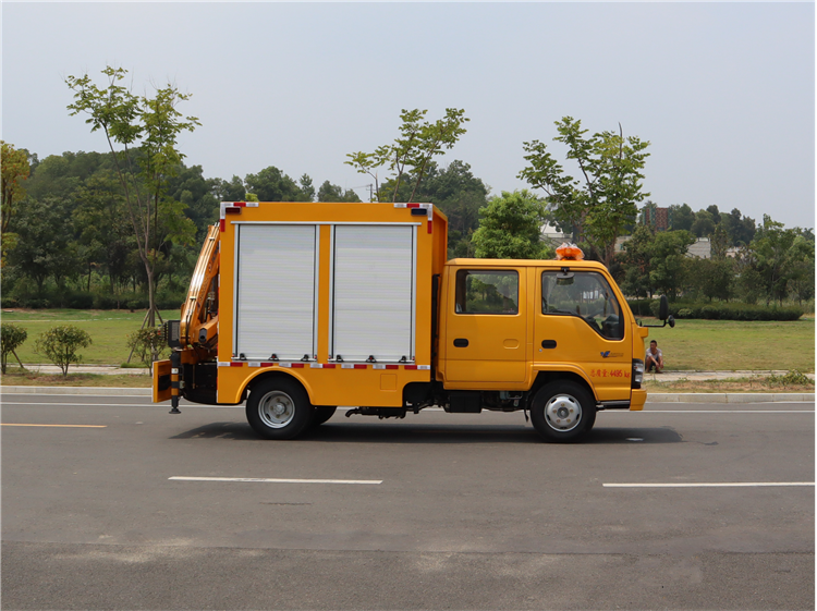 慶鈴五十鈴搶險救援車輛尾部安裝2噸徐工折臂吊機,最大額定起重質量:2000Kg,救援車輛兩側都可操作吊機工作。帶2個液壓支腿。救援車駕駛室頂帶工程黃工程燈,可選安裝場外照明燈,可升降。救援車廂頂可選安裝升降照明燈,可選升降8米-12米。救援車廂兩側帶2個卷簾門。內含發電機組、電控箱、排水系統等各類應急設備。駕駛室帶方向助力、冷暖空調機倒車影像。