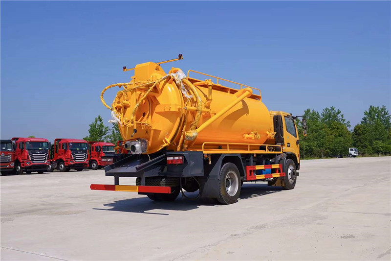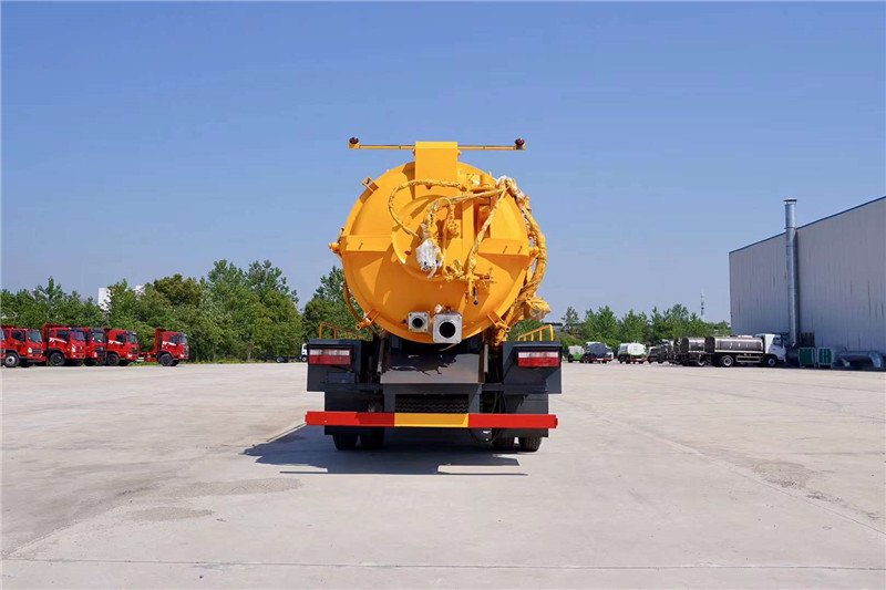 11方清洗吸污車上裝配置:吸污罐體厚6mm,選裝不帶卷簾門外觀,3方水+8方污,水污互通帶過濾網,清水箱互通兩邊接消防進水。雙耀215 流量高壓泵,Y型過濾器,配60米19通徑高壓管,10個高壓噴頭。吸污采用山東 SK-12 水循環泵,不銹鋼水循環泵水箱,罐體帶液壓舉升功能,后蓋液壓開啟,尾部一個 100 的球閥吸污,一個 150 的球閥排污,8 米吸污管一根。